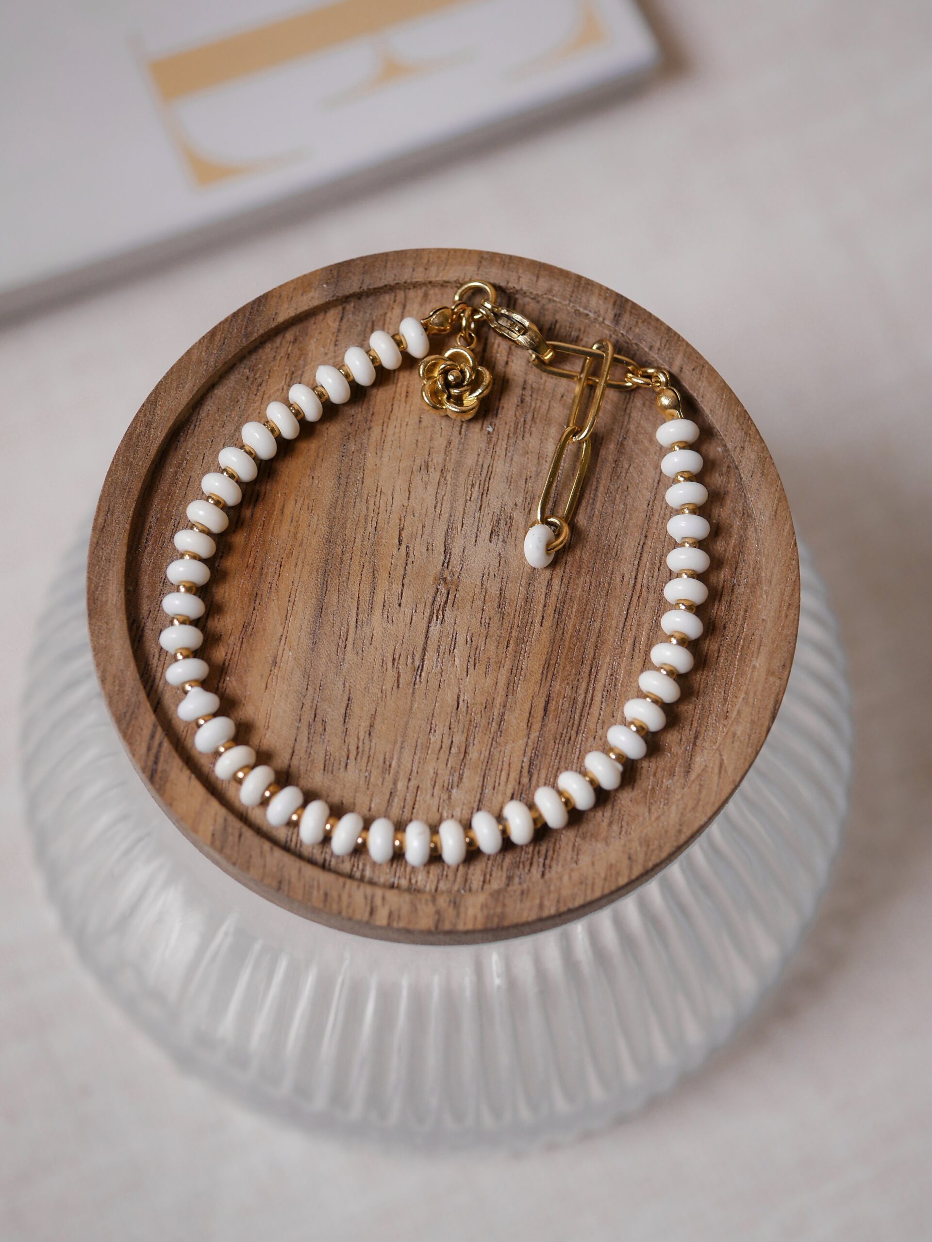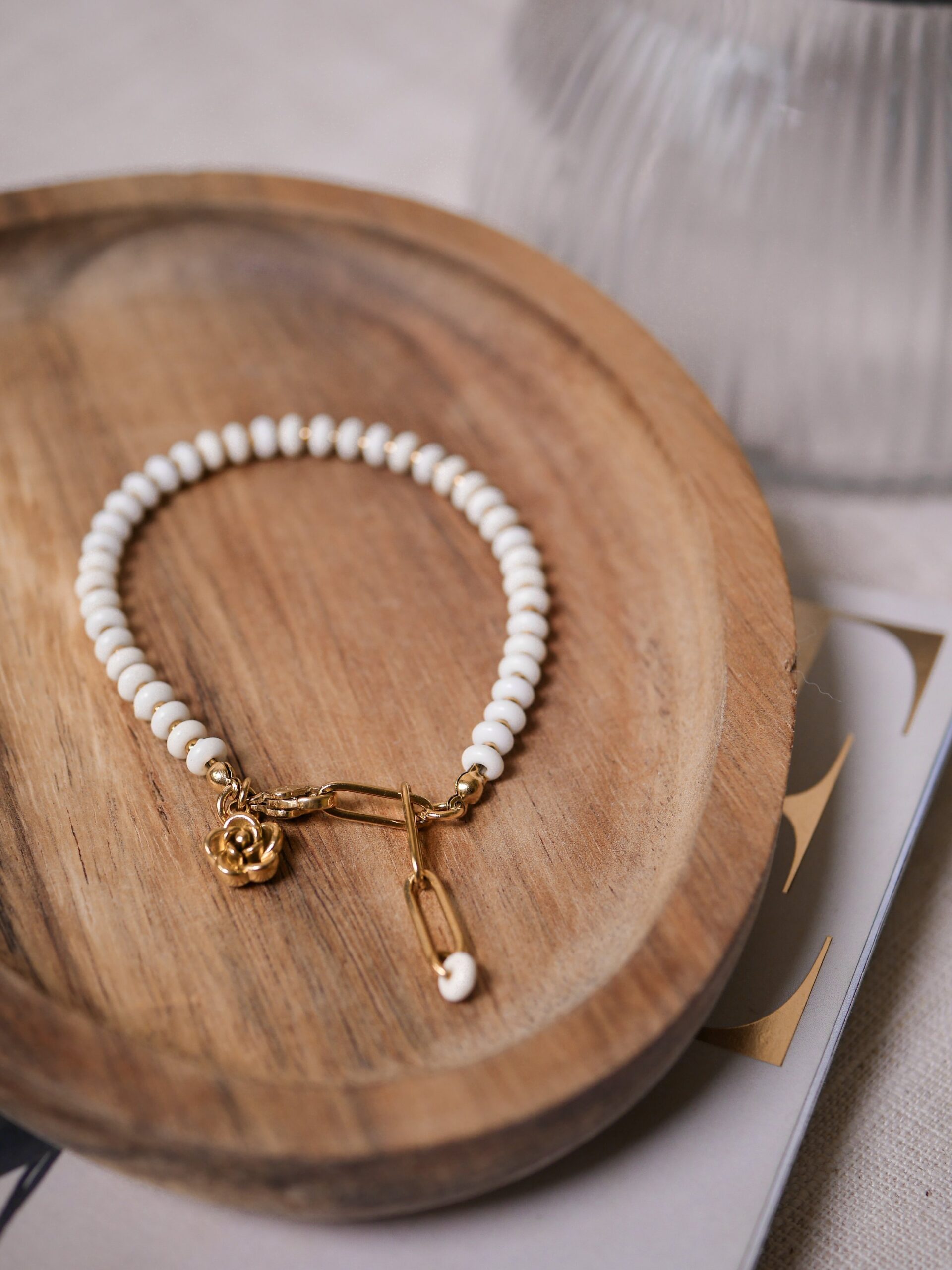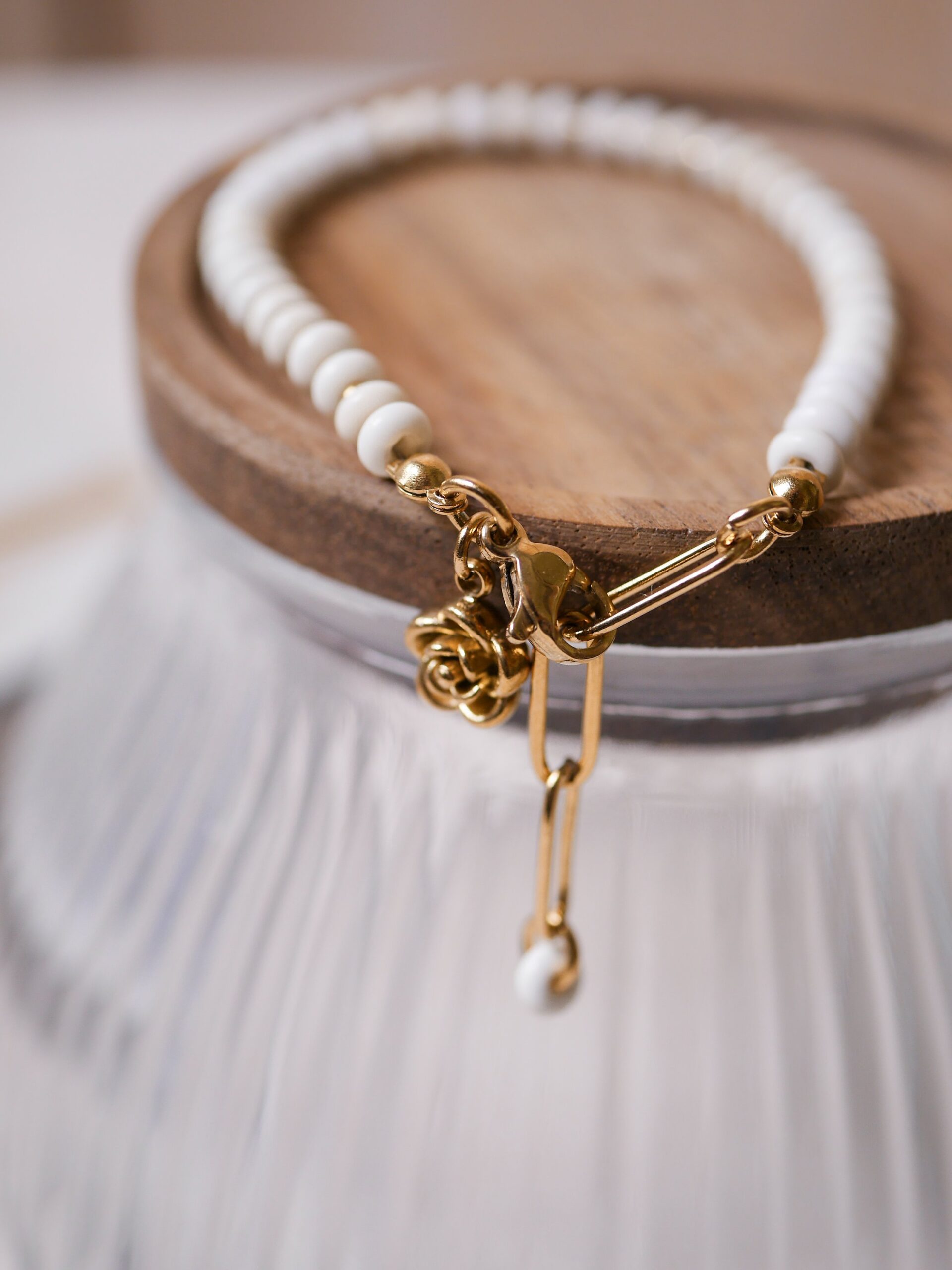 Bransoletka stworzona z Magnezytu w kolorze białym z uroszą zawieszką w kształcie róży.